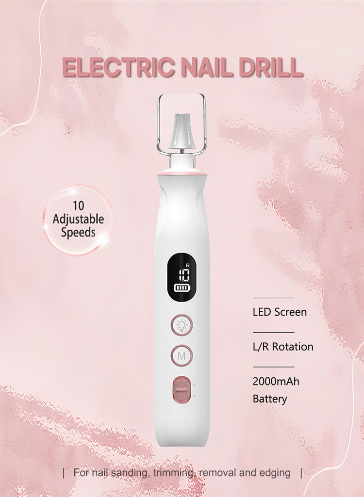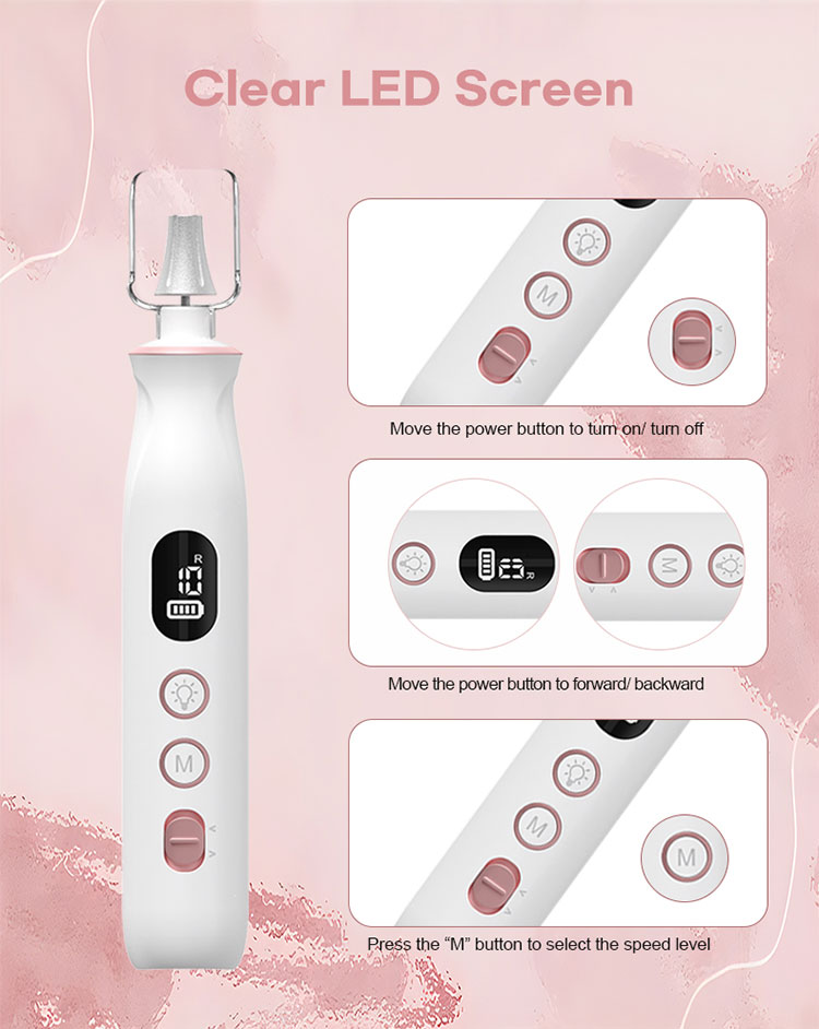 2:Powerful,10 Speeds & Dual Rotation, LCD Display, Memory Mode:This electric nail drill features 10 speed settings ranging from 2,700 to 20,000 RPM. It offers both clockwise and counterclockwise rotation, making it suitable for both left-handed and right-handed users. The LCD display clearly shows the speed levels, remaining power, and rotation direction. Additionally, the Memory Mode remembers the speed mode you last used for added convenience and customize your manicure and Pedicure mode