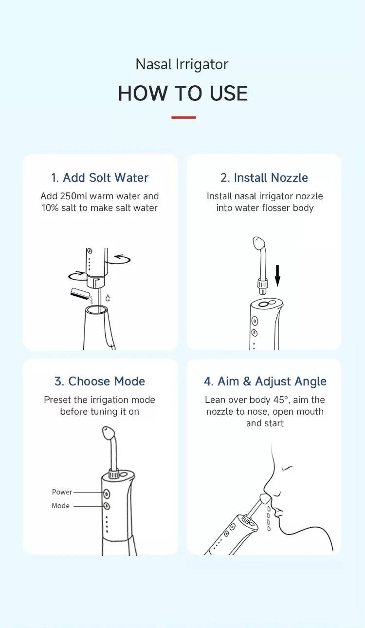 효과: 전기 비강 세척기는 일관되고 제어된 세척을 제공하여 비강을 철저하게 세척하고 부비강 건강을 촉진하도록 설계되었습니다.