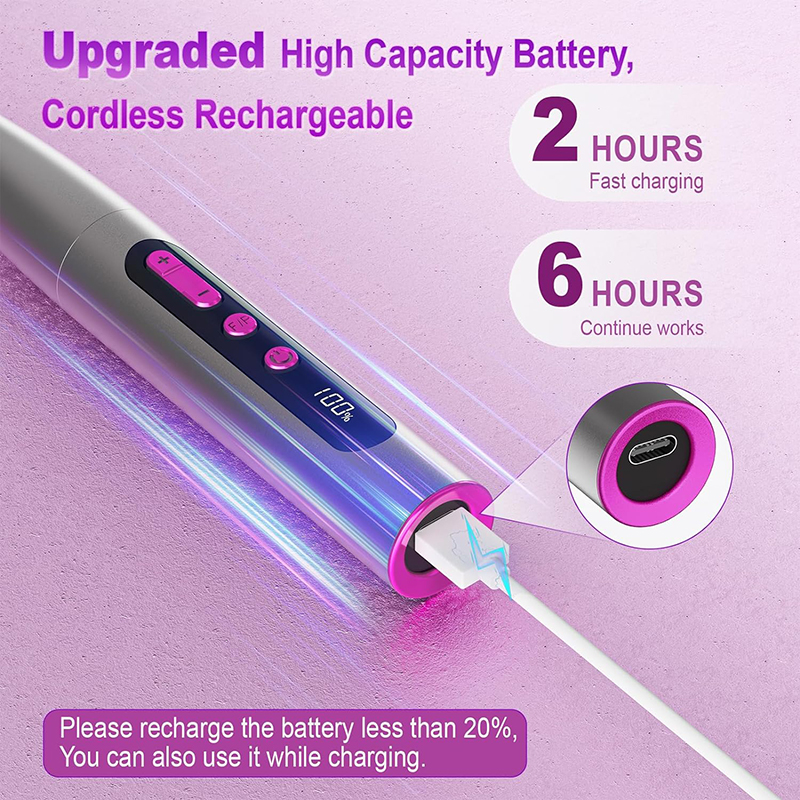 전동 네일 드릴 업그레이드된 대용량 배터리, 2시간 고속 충전 및 6시간 연속 작업 가능. 전기 네일 파일은 USB 전원 어댑터, 노트북, 모바일 전원 등에 적합합니다. 무선 네일 드릴 전력이 20% 미만인 경우 충전 중에도 사용할 수 있습니다.