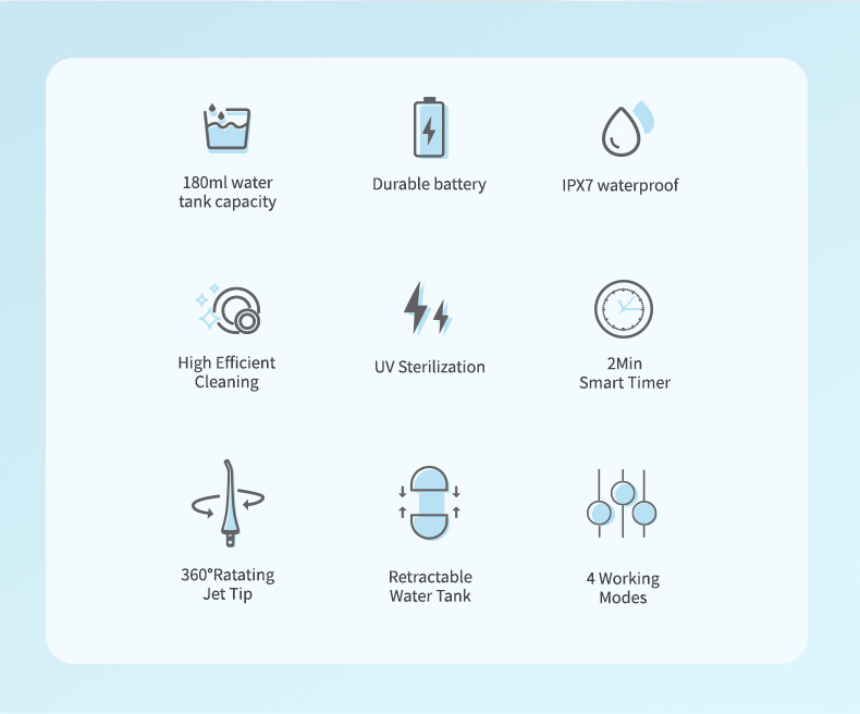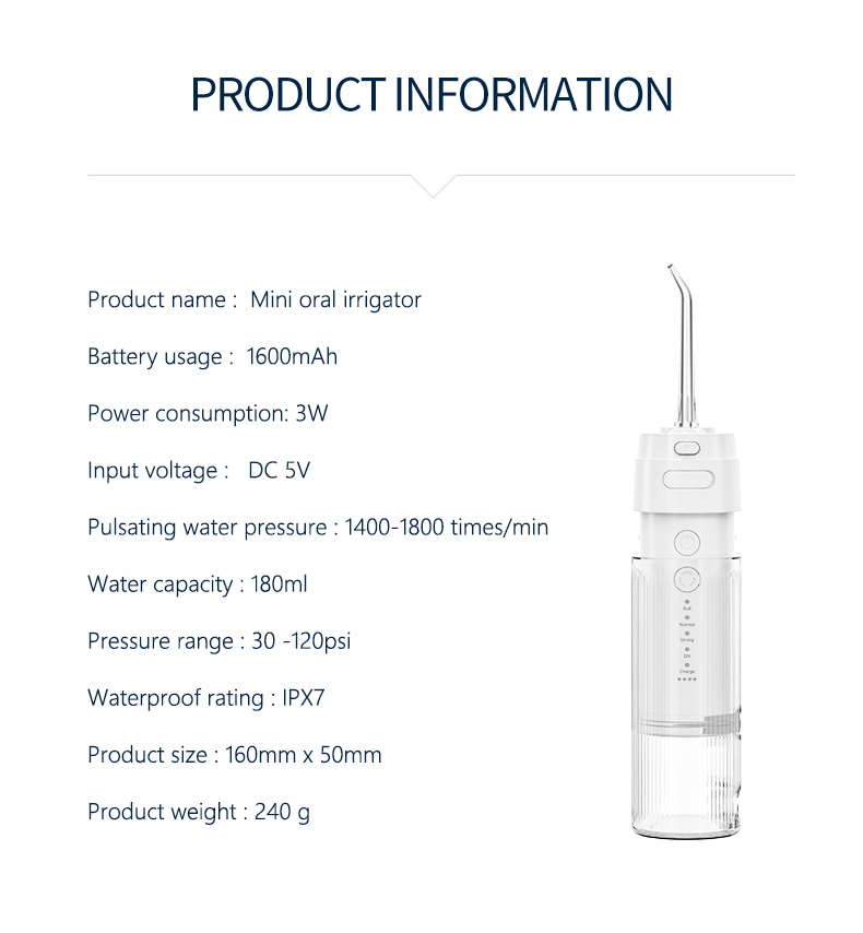 이 워터 플로서 치과용 픽은 분당 1400-1800회의 높은 수압 펄스를 제공하여 치아를 깊이 세척하기 위해 99.9%의 치태를 효과적으로 제거합니다. 이 워터 플로서 치과용 픽은 잇몸을 마사지하고 혈액 순환을 촉진하며 구취, 교정 치아와 같은 구강 문제를 해결합니다.