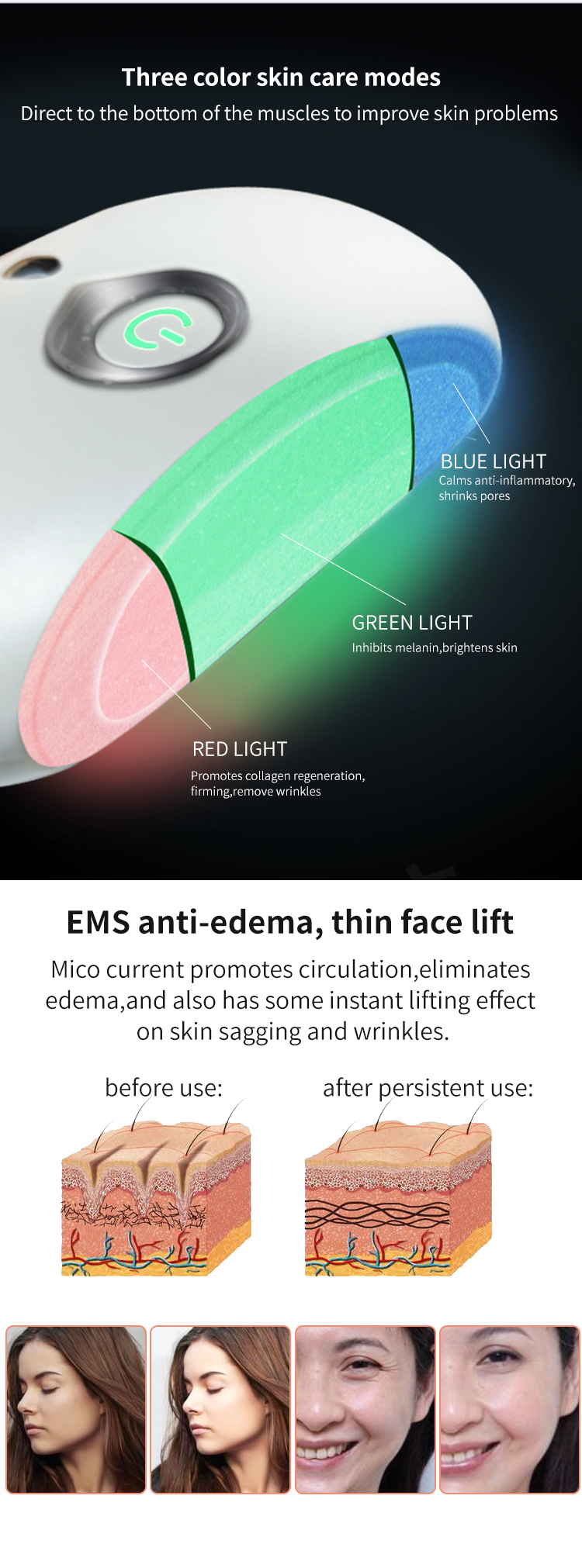 세 가지 컬러 스킨 케어 모드, 근육 바닥까지 직접 자극하여 피부 문제 개선