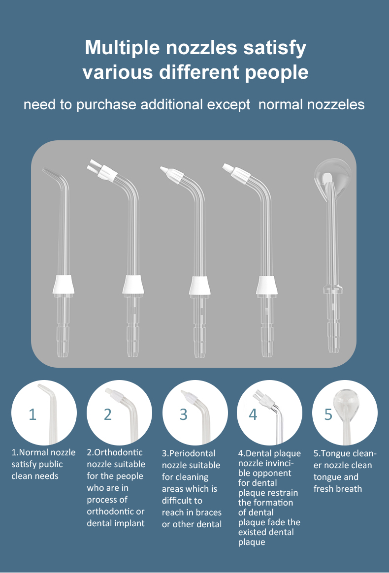 미국 치과 팀이 전문적으로 평가한 당사의 치실은 99% 다양한 연령층의 다양한 요구에 맞는 5가지 편리한 모드를 제공하는 동시에 최적의 성능과 수명을 보장합니다. 인체공학적 핸들과 6개의 교체 가능한 노즐은 편안하고 다양한 경험을 보장합니다. 생일, 크리스마스 추수감사절 발렌타인 아버지 어머니 날 사랑하는 사람의 구강 건강을 돌보는 사려 깊은 선물이 됩니다.