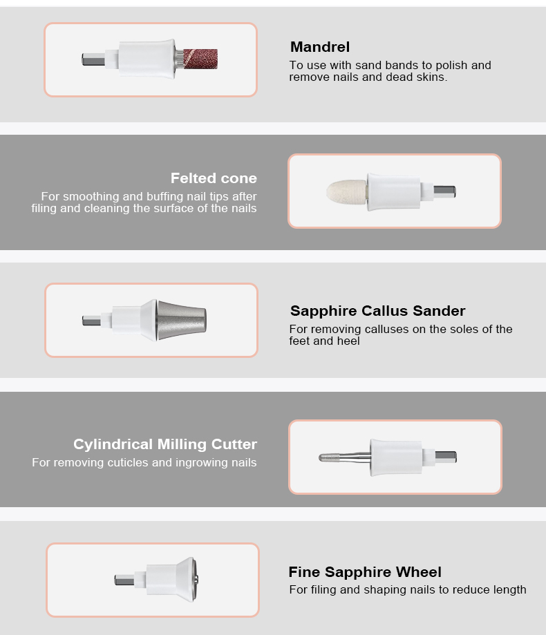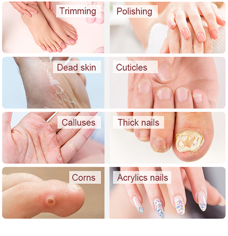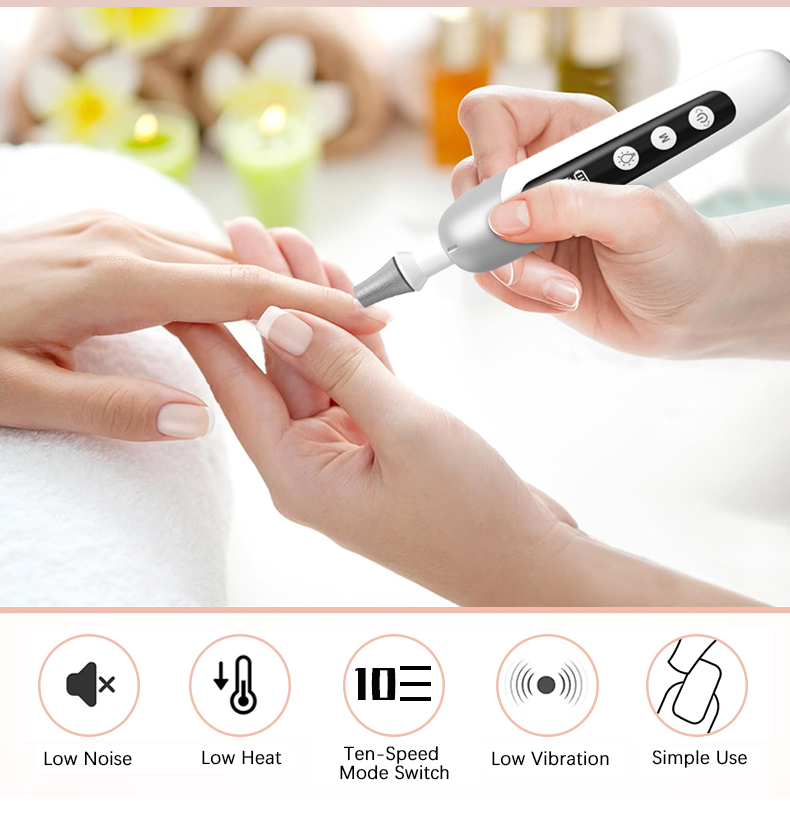 - 무선 및 충전식: 무선 전기 네일 드릴은 여행에 적합하며 인상적인 10시간 작동 시간을 제공합니다. 발과 모든 매니큐어 및 페디큐어에 필요한 편리한 페디큐어 도구입니다. 당사의 네일 파일은 천연, 아크릴, 젤 및 딥 파우더 네일에 적합합니다.
