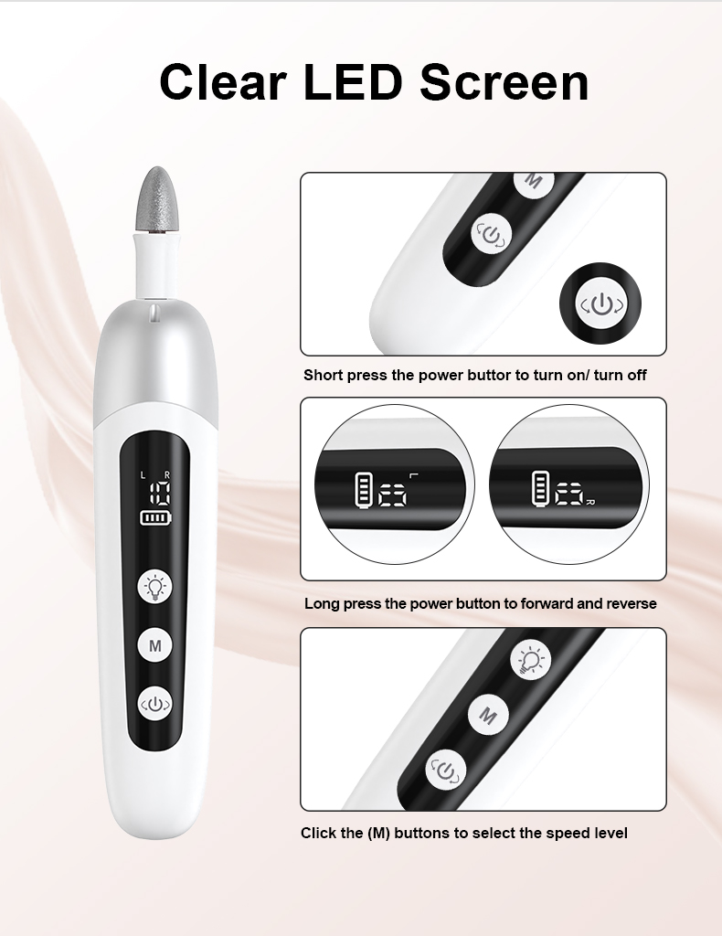 - 혁신적인 LED 디스플레이: 원하는 설정을 손쉽게 탐색합니다. LED 디스플레이는 배터리 상태, 속도 선호도 및 회전 설정을 표시하여 손쉽게 조작할 수 있습니다. 전기 네일 파일 머신에는 손과 발의 영역을 비추는 통합 LED 조명도 장착되어 있습니다.