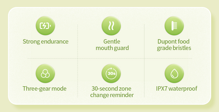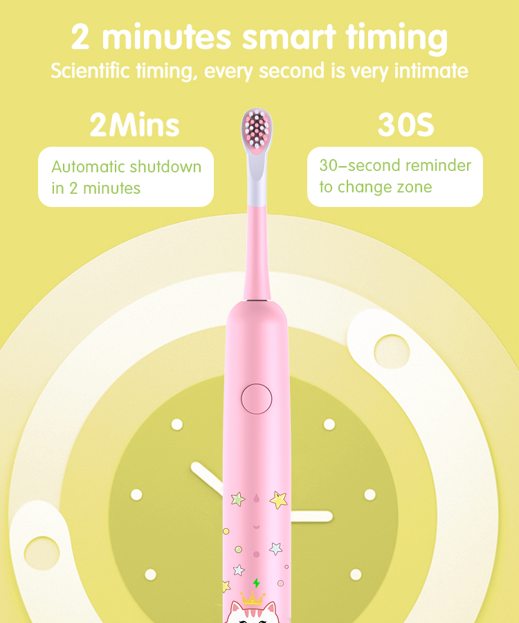- 자동 타이머: 이 전자 칫솔에는 2분 스마트 타이머가 내장되어 있어 아이가 더 오랜 시간 동안 양치질을 하도록 돕고, 좋은 양치질 습관을 기르며 충치를 줄이는 데 도움이 됩니다.