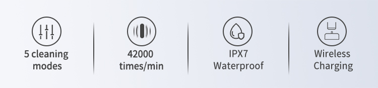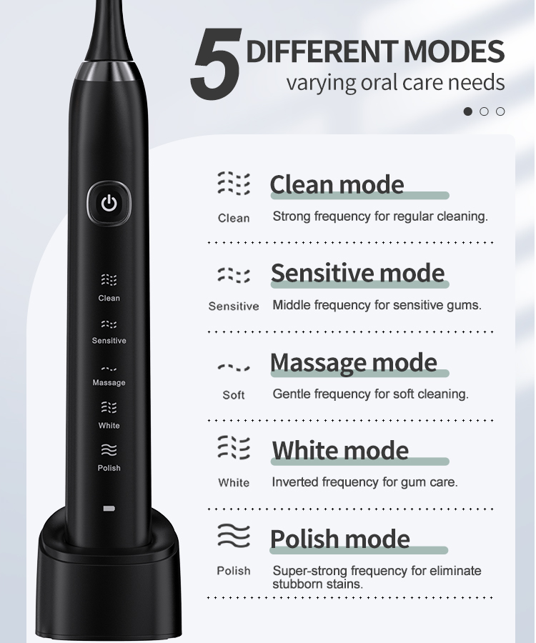 - 5가지 고성능 브러싱 모드 - 세척(부드럽게), 미백(강하게), 광택(강한 반전 주파수), 마일더(부드러운 반전 주파수) 및 민감(부드럽게) 모드가 치아와 잇몸의 다양한 상태에 맞게 제공되므로 선호도와 치과 의사의 권장 사항에 따라 다양한 모드를 선택할 수 있습니다.